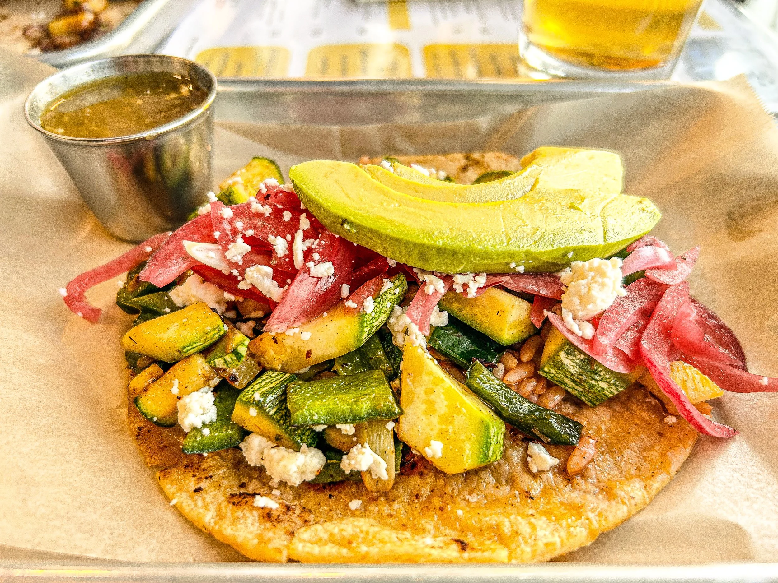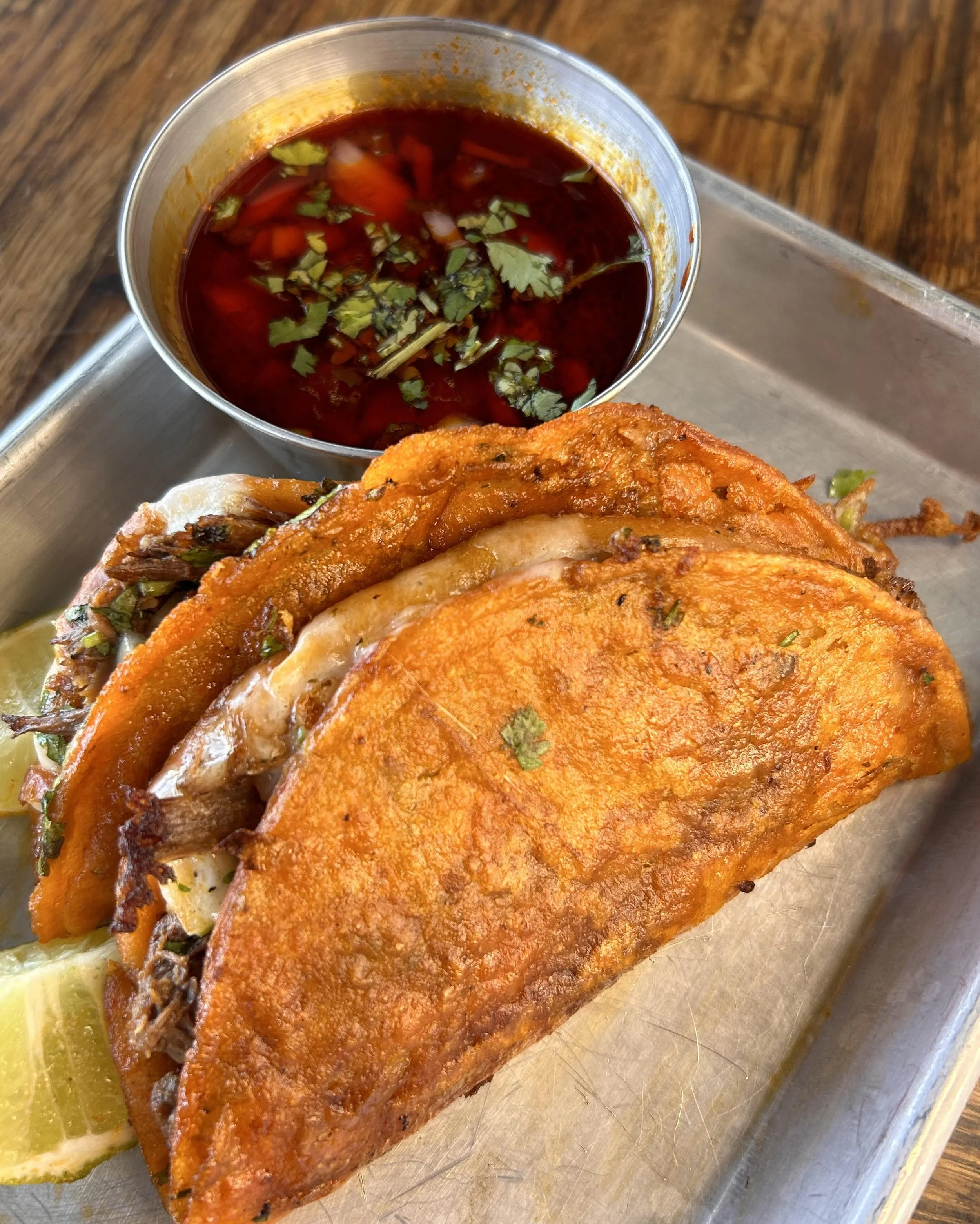food menuall dishes made from scratch. botanas/small bites PUPUSA (GF)(Veg) el salvadoran thick corn tortilla stuffed with cheese, grilled & topped with curtido slaw & molcajete salsa: [pick your filing] *spinach & cheese OR *black bean & cheese LLAPINGACHOS (GF)(Veg) ecuadorian potato and cheese cakes topped with red onion escabeche, curtido slaw & molcajete salsa GRANDE CHIPS & SALSA (Veg) in-house chips made fresh daily, served with salsa trio for sharing- *mild-salsa molcajete * med-salsa verde * hot- salsa roja made fresh daily- avocados, limes, salt, tomato served with in-house chips. GUACAMOLE & CHIPS (veg) limited availability made fresh daily- avocados, limes, salt, tomato served with in-house chips. tacos Served a la carte on fresh, small-batch, locally-made corn tortillas (GF) AL PASTOR spit-grilled (on the in-house trompo) marinated pork, grilled fresh pineapple, salsa de aguacate, cilantro & onion CARNE ASADA carne asada, mexican-fried rice, refried beans, curtido slaw & molcajete salsa CARNITAS mexican-style braised pork, queso asado, cilantro, onion, & your choice of salsa AL JARDIN (veg) roasted poblano & calabaza (mexican zucchini), refried beans, mexican rice, red onion escabeche, queso fresco, avocado & your choice of salsa CHICKEN TINGA shredded chicken stewed in housemade chipotle adobo, red onion escabeche, queso fresco, mexican crema, cilantro, and your choice of salsa QUESABIRRIA [2 per order] tender beef simmered in a flavorful stew & shredded, queso asado, onions and cilantro. served with a side of consomme for dipping. tortas served on fresh, locally-baked pan bolillo CARNITAS AHOGADA carnitas, red-onion escabeche & queso fresco drowned in a savory tomato broth made in-house PEPITO DE ASADA carne asada with chimichurri, sliced tomato, spinach, avocado & red onion escabeche AL JARDIN (veg) roasted poblano and calabaza, refried beans, mexican fried rice, red onion escabeche, queso fresco & sliced avocado CHICKEN TINGA TORTA shredded chicken stewed in housemade chipotle adobo, queso fresco, spinach, red onion escabeche, tomato & avocado breakfast menu available 10am-2pm Sat & Sun BREAKFAST TACO eggs, potato, queso fresco, rice & beans, red onion escabeche & choice of protein- chorizo, carnitas, carne asada, chicken tinga, or veggies BREAKFAST LLAPINGACHOS ecuadorian potato & cheese cakes, grilled and topped with eggs, red onion escabeche & salsa molcajete AVOCADO MOLLETE open-faced bolillo layered with refried beans, melted cheese, sliced avocado, tomato, red onion escabeche, crema, queso fresco, cilantro, & your choice of salsa.